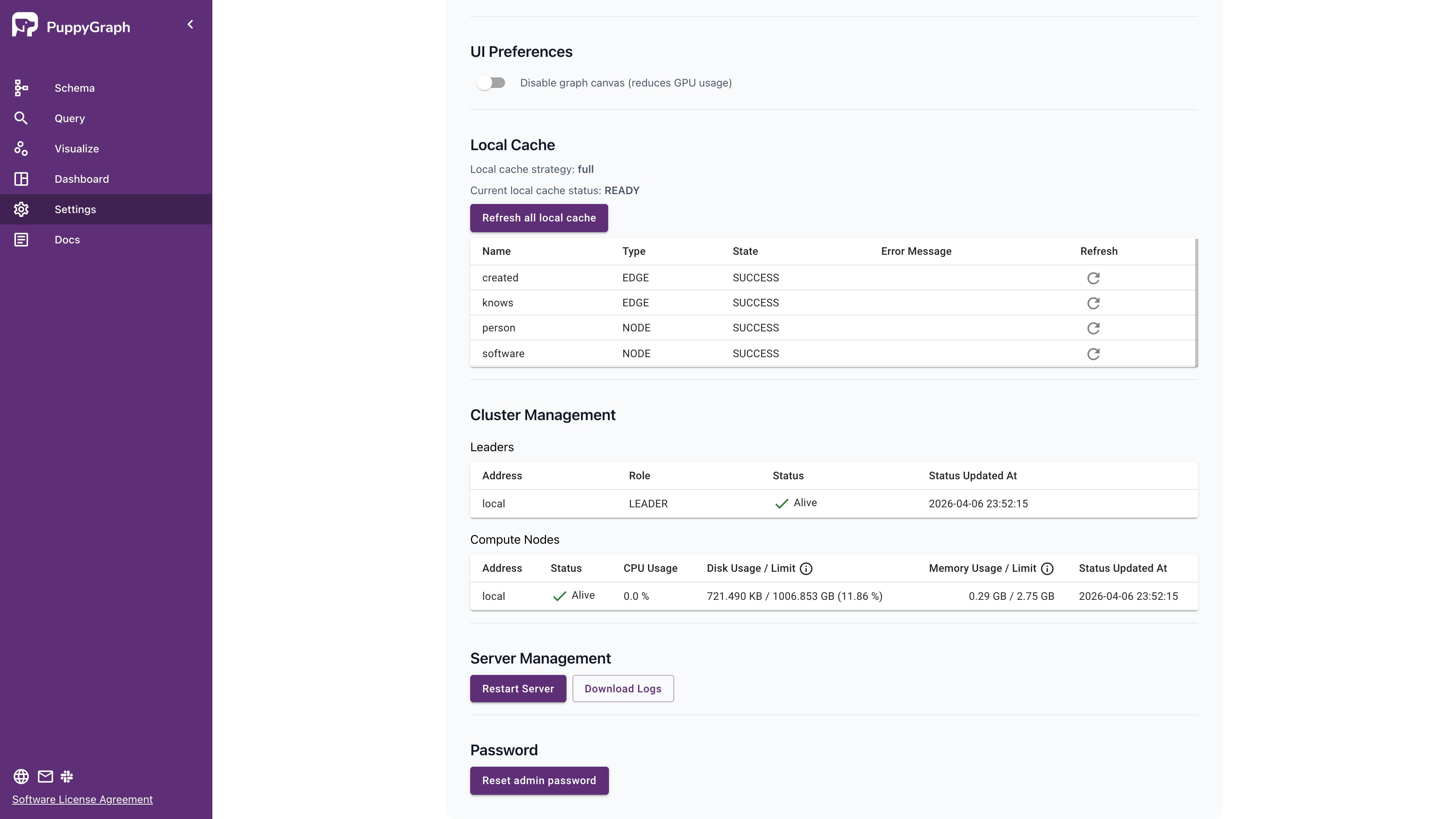 The Local Cache section displays locally cached data on PuppyGraph. You can refresh the cache for individual nodes or edges, or refresh the entire cache. To learn more about the local cache, see Locally Cached Graph Data.